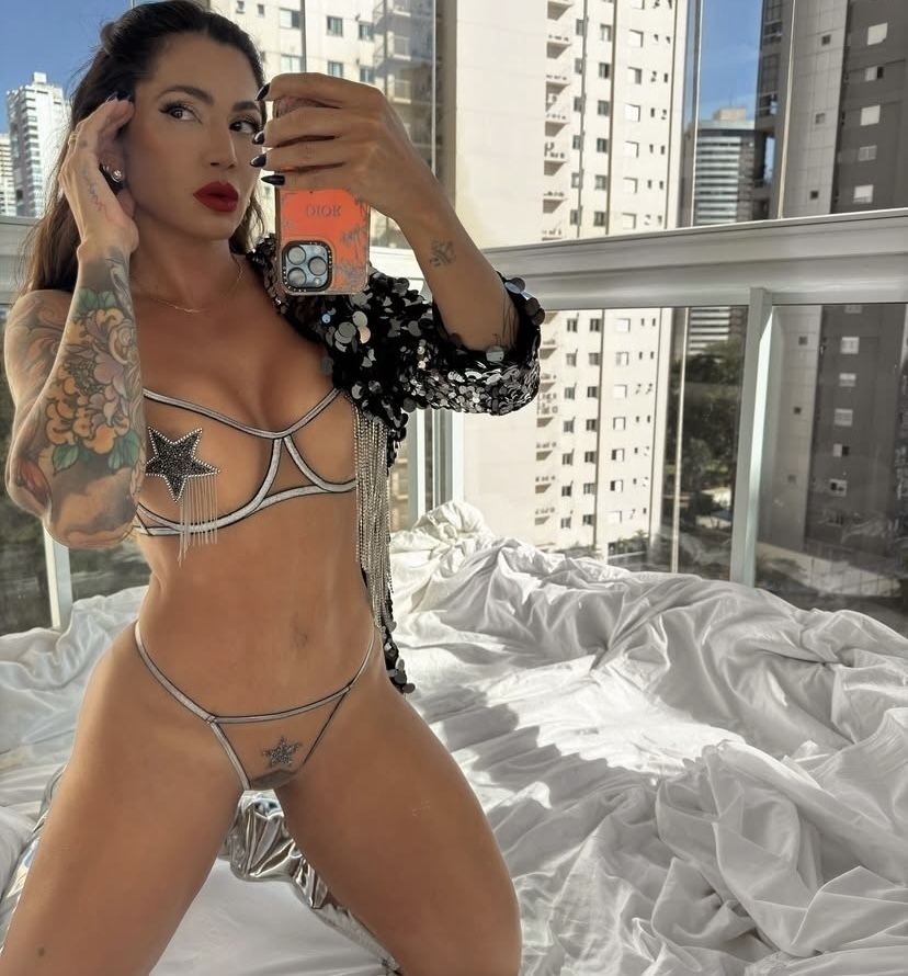 Conjunto absolutamente perfeito, em tule ilusion e aplicação de estrela com strass.